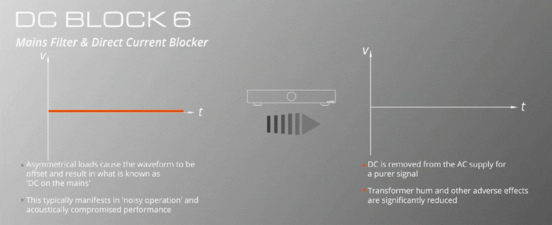 Ved at blokere eller annullere den jævnstrøm, der findes i vekselstrømsforsyningen, korrigerer DC BLOCK 6 jævnstrømsforskydningen og genbalancerer lysnettets sinusbølge. Men håndtering af »DC på lysnettet« er ikke den eneste fordel ved denne dobbeltvirkende enhed - den indeholder også et højtydende filtreringskredsløb i audioklasse, der fjerner RFI/EMI-forureninger fra lysnettet. Dette er effektivt til at reducere både differential-mode-støj (forværret af billige switch-mode-strømforsyninger, der bruges af mange husholdningsapparater) og common-mode-støj (forværret af luftbåren interferens fra telefoner, Wi-Fi-netværk og Bluetooth).