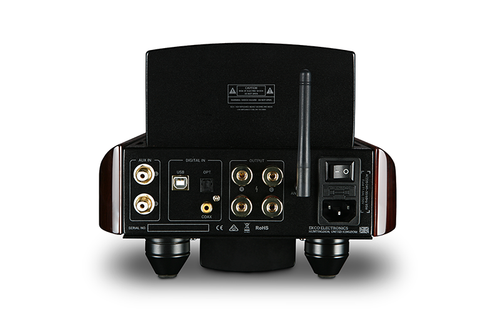 EV55ST:s stålchassi är inklämt mellan matchade, handgjorda massiva träpaneler (Deep Louro Petro) i pianoblank finish. Det är design influerad av Ekcos original bakerlite FM-radio med en modern twist för att matcha de mest eleganta vardagsrummen.